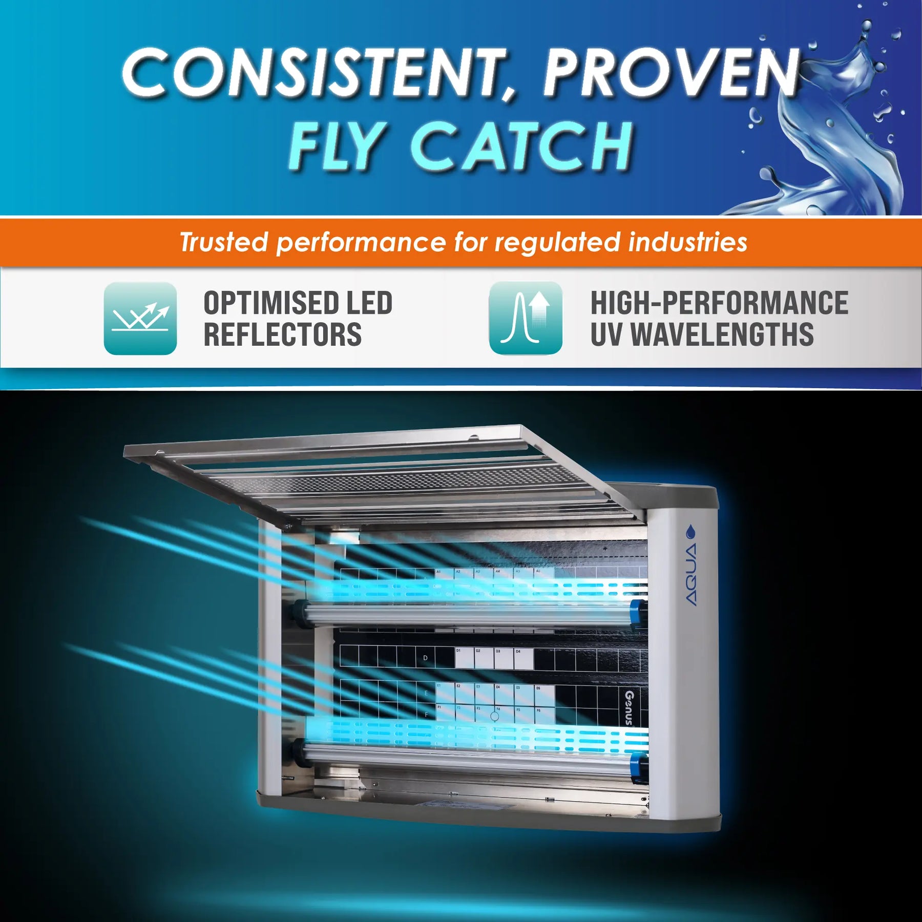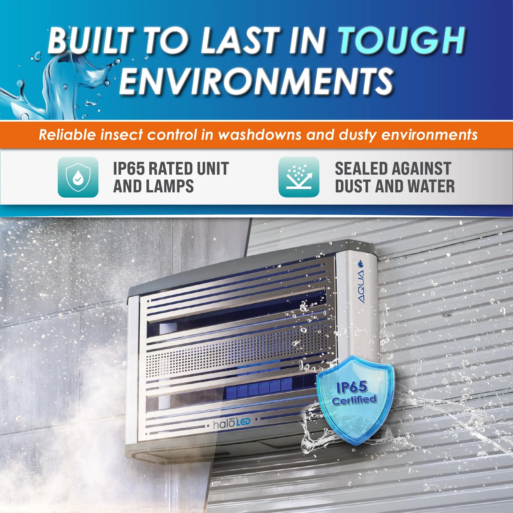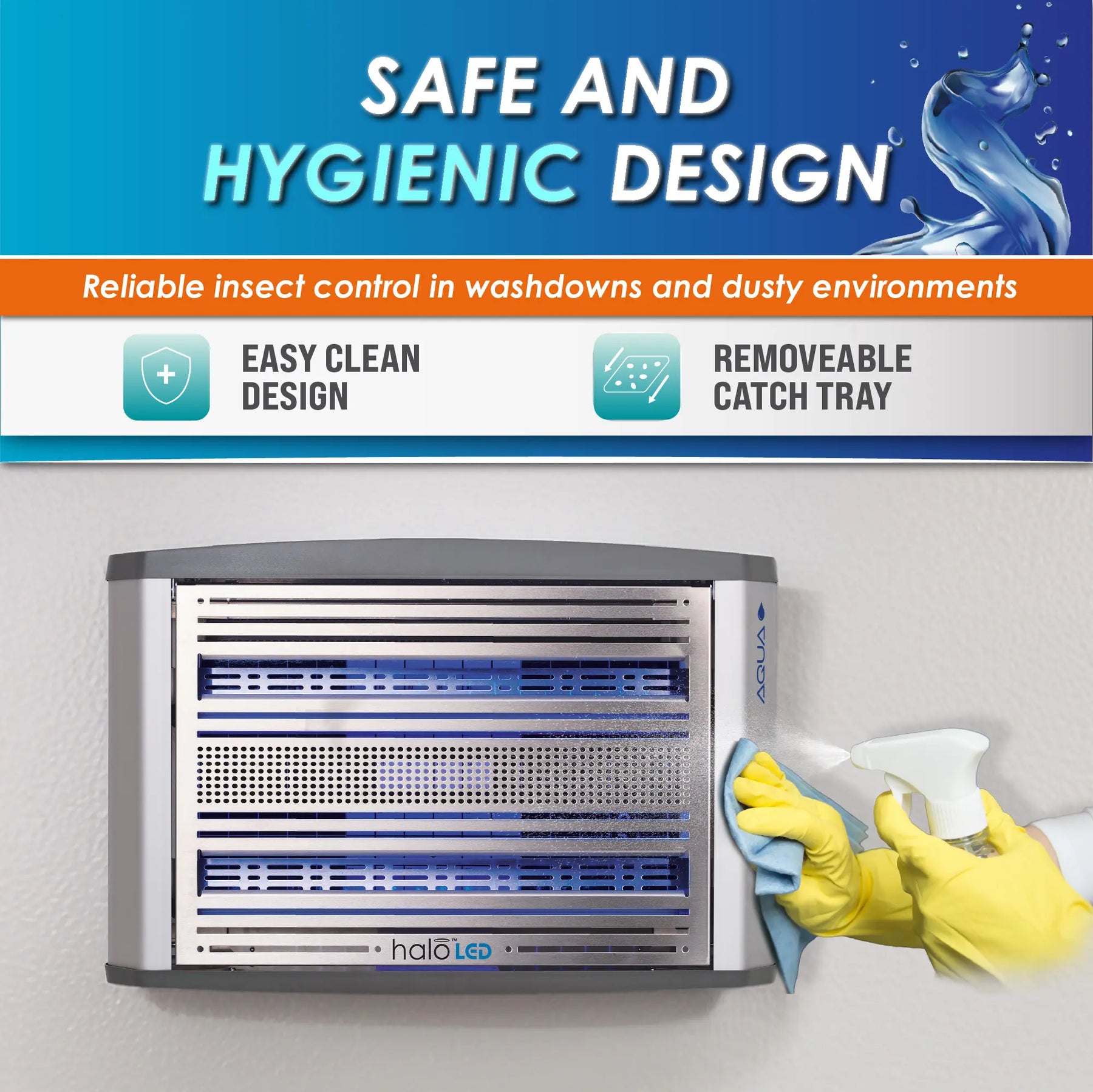 „Halo 30 LED Aqua“ praplečia patikimo „Halo“ asortimento galimybes, pritaikytas drėgnoms, šlapioms ir sunkiai plaunamoms aplinkoms. Pagamintas su IP65 klasės korpusu, sandariomis LED UV lempomis ir laidiniu maitinimo prijungimu, jis užtikrina patikimą veikimą ten, kur standartiniai įrenginiai negali. Priežiūra be įrankių, viršuje atidaromas priekinis dangtelis ir šoninė klijų plokštelė leidžia greitai ir paprastai prižiūrėti. Apjungiant tvarumą ir ilgaamžiškumą, „Halo 30 LED Aqua“ užtikrina nuoseklią musių kontrolę ir atitiktį higienos reikalavimams tokiose higienai svarbiose srityse kaip maisto gamyba, sveikatos priežiūros ir farmacijos įmonės. Patikimas, efektyvus ir lengvai prižiūrimas.
