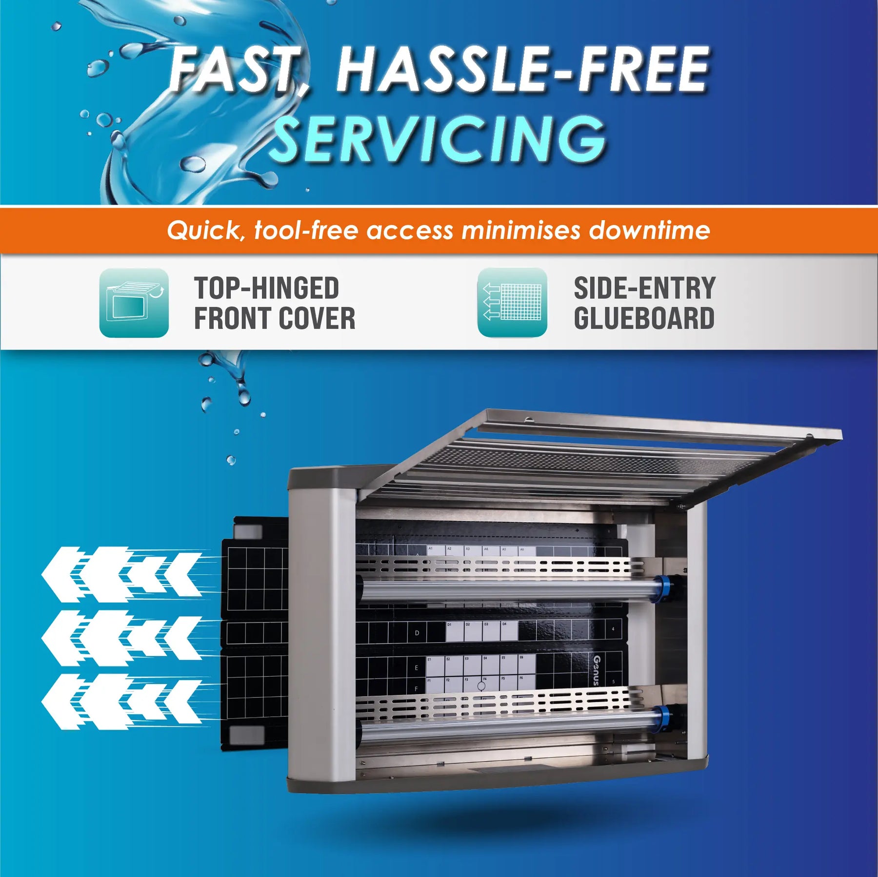 • Viršuje atidaromas priekinis dangtis: suteikia greitą prieigą be įrankių, kad būtų lengva aptarnauti ir pakeisti klijų lentą.