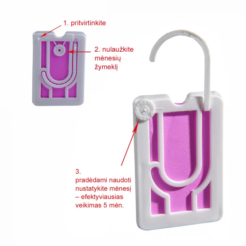 išimti vieną pakabinamąjį blokelį iš dėžutės ir nuimti pakuotę, pakabinti ant spintos turėklo arba ant vidinės spintos durų pusės.